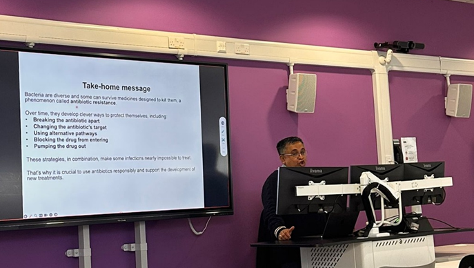 This was followed by a taster lecture by Professor Bhakta where he addressed the molecular mechanisms through which a bacterium can become resistant to different antibiotics. He further introduced his research on understanding the spread and rise of antibiotic resistance in tuberculosis (TB), one of the deadliest diseases on earth. He also highlighted the novel drug discovery approaches undertaken by his lab, uncovering the mechanisms of resistance related to TB. The talk also highlighted a collaborative partnership with researchers globally to tackle the problem of antibiotic resistance in TB.